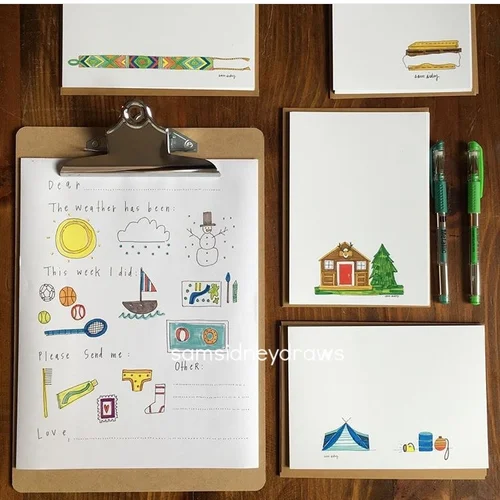 Notecards for your little camper. 25 cards for $60. Envelopes included. Check list notepads, 25 pages for $40. (gel pen and clipboard included)