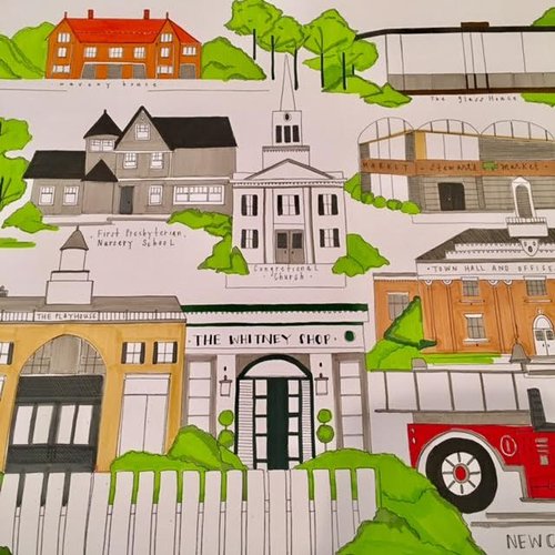 Illustration featuring all of New Canaan, CT's most established landmarks: The Glass House, The Waveny House, Congretional Church, The Whitney Shop, Town Hall... and many others.